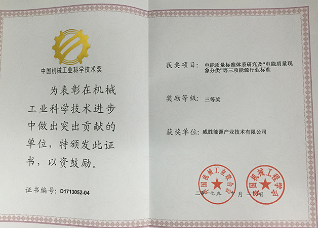 近日,从中国机械工业联合会获悉,惟远能源参与申报的《能源电能质量标准体系研究及“电能质量现象分类”等三项能源行业标准》项目荣获中国机械科学技术奖三等奖,该奖是我国机械行业权威科技奖项之一。