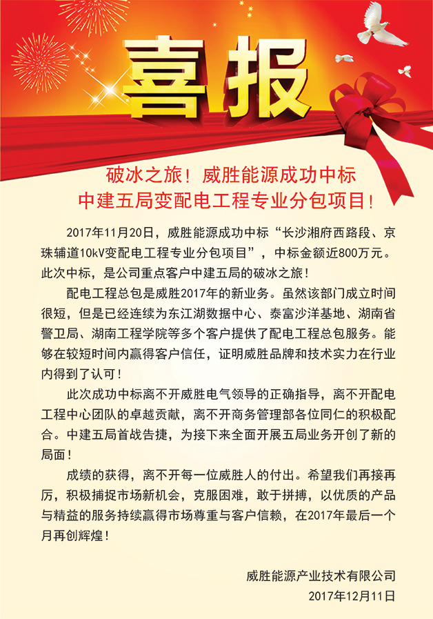 2017年11月20日,惟远能源成功中标“长沙湘府西路段、京珠辅道10kV变配电工程专业分包项目”,中标金额近800万元。此次中标,是公司重点客户中建五局的破冰之旅!