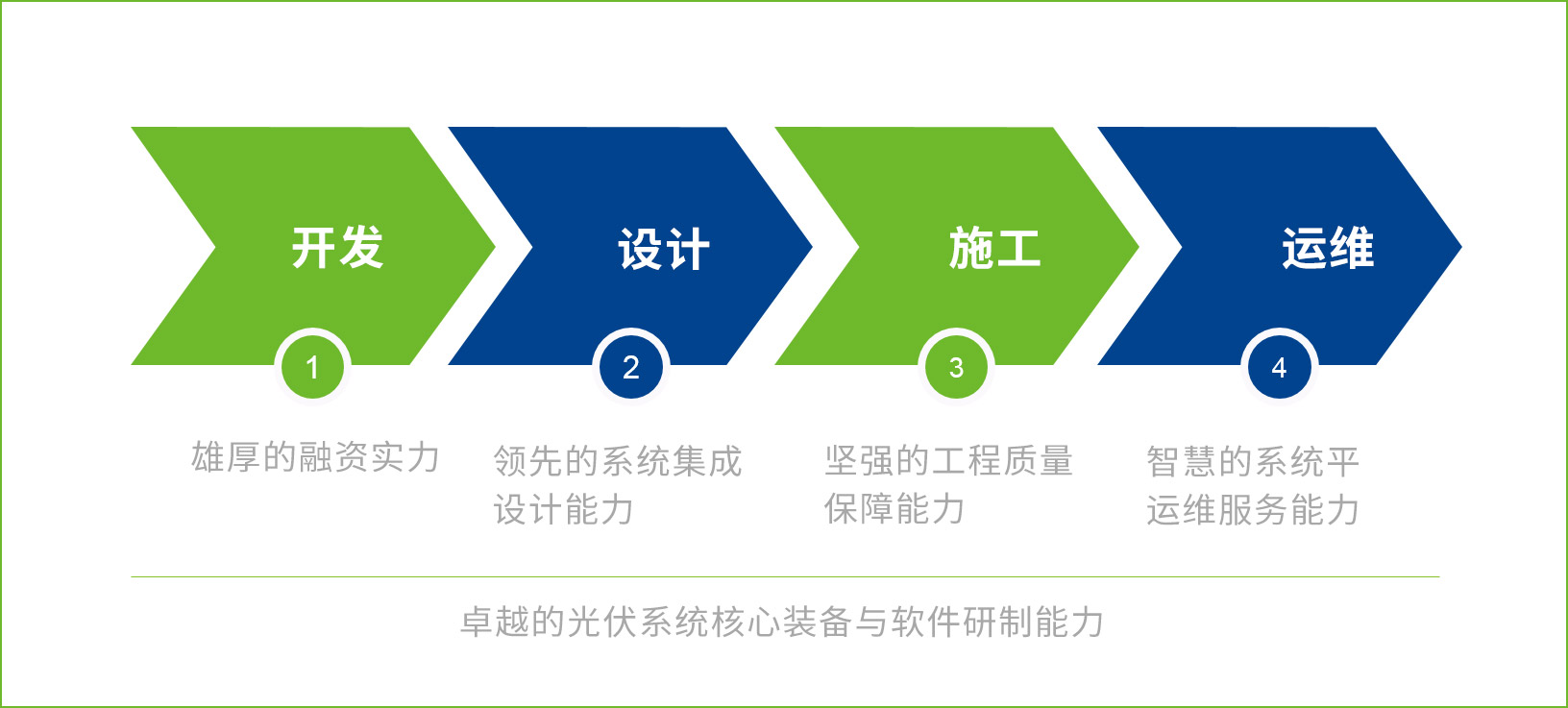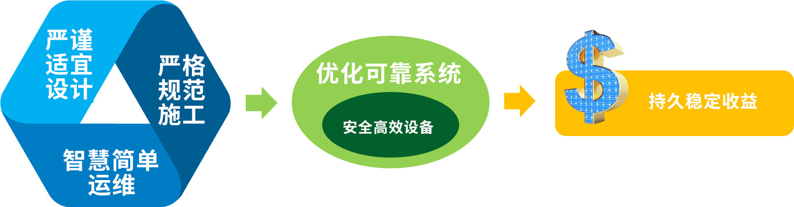 我们通过严谨适宜的设计、严格规范的施工和智慧简单的运维,建设并运营一个由安全高效的设备组成的优化可靠的新能源发电系统,希望业主能收获持久稳定的收益。