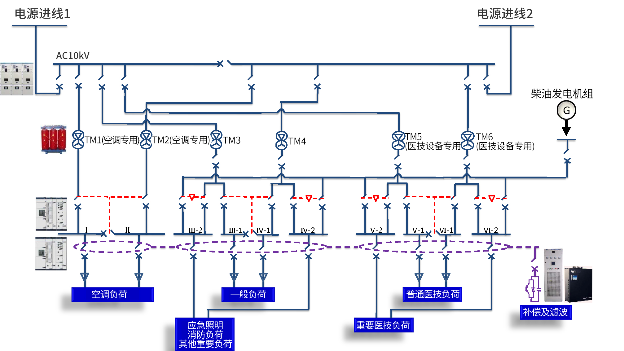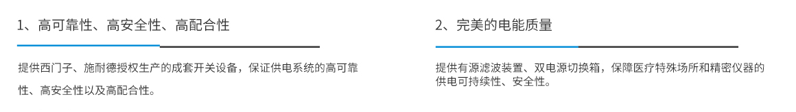 根据医院配电系统的特殊性,我司设计了高可靠性、高安全性的配电系统。中低压配电开关柜可选用施耐德或西门子授权柜;特殊医疗场所,如手术区等,可选用高可靠性的双电源切换箱;针对精密医疗设备,对电能质量要求特别高的场合,可选用具有完美滤波功能的壁挂式有源滤波装置,节省占用空间,也方便后期改造扩容。