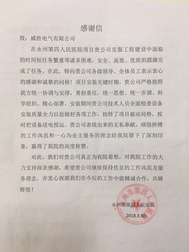 近日,威胜电气收到了永州市第四人民医院发来的表扬信,感谢我公司的优质服务。