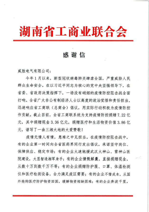 近期,威胜电气先后收到来自中共湖南省委、湖南省人民政府及湖南省工商业联合会的感谢信,信中表达了对威胜电气在疫情期间驰援一线善举的肯定与赞扬。