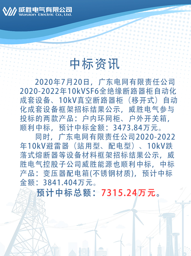 2020年7月20日,广东电网有限责任公司2020-2022年10kVSF6全绝缘断路器柜自动化成套设备、10kV真空断路器柜(移开式)自动化成套设备框架招标结果公示,威胜电气参与投标的两款产品:户内环网柜、户外开关箱顺利中标,预计中标金额:3473.84万元。同时,广东电网有限责任公司20202022年10kV避雷器(站用型、配电型)、10kV跌落式熔断器等设备材料框架招标结果公示,威胜电气控股子公司惟远能源也顺利中标,中标产品:变压器配电箱(不锈钢材质),预计中标金额:3841.404万元。预计中标总额:7315.24万元