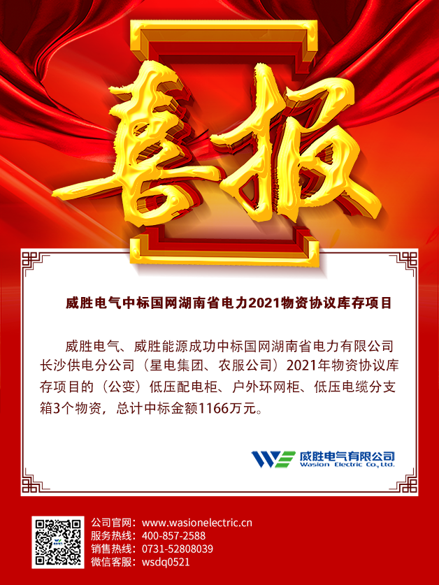 威胜电气、惟远能源成功中标国网湖南省电力有限公司长沙供电分公司(星电集团、农服公司)2021年物资协议库存项目的(公变)低压配电柜、户外环网柜、低压电缆分支箱3个物资,总计中标金额1166万元。