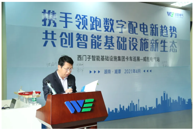 随后西门子华中区大区经理洪海宁先生上台致辞,他首先表示非常高兴此次西门子卡车巡展活动能在威胜电气举办。威胜电气是西门子在华中区域的重要合作伙伴,同时也作为一家有崇高理想使命的公司,现在已经发展成为华中区域乃至全国知名的智能配用电领域的服务专家。今天西门子也借电气智能化主题开放日这个契机,用卡车秀的形式,一方面希望把西门子智能基础设施集团的先进技术带给大家,另一方面也希望在后疫情时期加强和行业伙伴面对面沟通交流的机会。