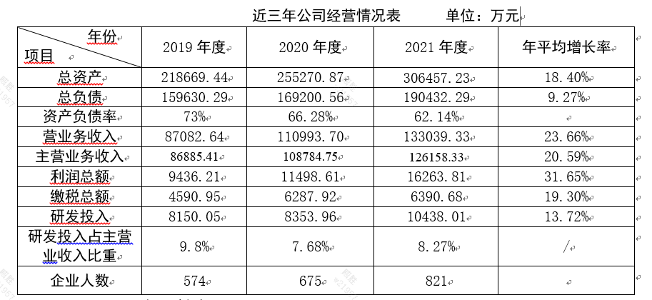 截止2021年12月31日,公司总资产306457.23万元,负债率62.14%,营业收入133039.33万元,利润总额16263.81万元,缴纳税费6390.68万元,研发投入10438.01万元,占比主营业收入8.27%。公司近三年经营情况如下: