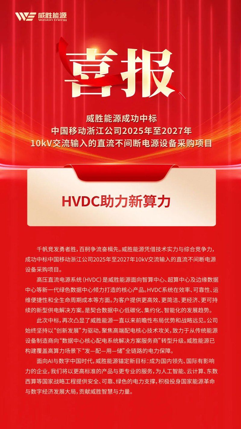 千帆竞发勇者胜,百舸争流奋楫先。威胜能源凭借技术实力与综合竞争力,成功中标中国移动浙江公司2025年至2027年10kV交流输入的直流不间断电源设备采购项目。