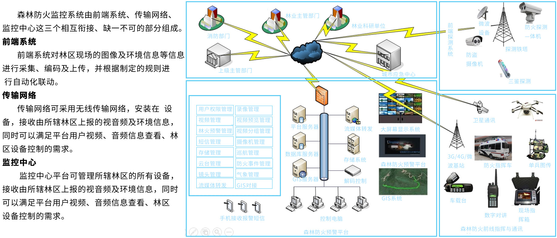 智慧森林防火监控系统,就是利用无缝融合的智能图像识别技术、面向对象的3D GIS技术、大型网络监控技术等高新技术,结合林业管理的专业知识和林业防火的经验,实现林区视频的自动监控、烟火准确识别、火点精确定位、火情蔓延趋势推演、扑救指挥的辅助决策、灾后评估等多方面功能,建立森林防火的完整业务链,并针对性地解决用户的各种个性化需求,最终实现对林区的保护和可持续发展。